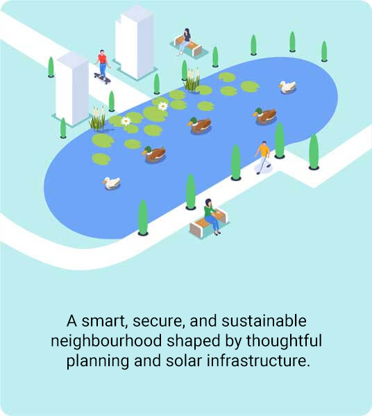 Suryagram includes solar-ready rooftops, rainwater harvesting systems, native landscaping, EV readiness, and universal accessibility — making it a future-ready community.